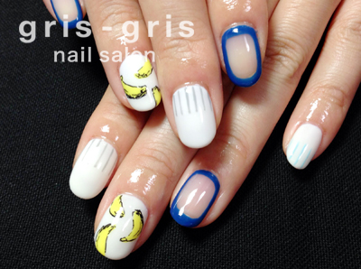 バナナ〜〜ですよ〜〜ブルーと白、バナナ色のカラーリングが夏ですね〜ブルーの色の分量が重くならなくて絶妙なバランスです。参考価格¥8000桜新町 用賀 ネイルサロン グリグリJUGEMテーマ:ジェルネイルJUGEMテーマ:カルジェル Calgel