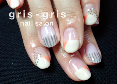 グレーとオレンジが可愛いネイルです。パッツンフレンチを基本に、グレーのラインとドット、そしてオレンジの△が印象的に仕上がりました。参考価格¥8200桜新町 駒沢 ネイルサロン グリグリJUGEMテーマ:ジェルネイルJUGEMテーマ:カルジェル Calgel