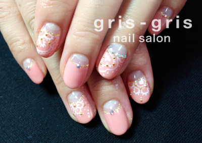 コーラルピンクの逆フレンチに白い更紗を描きました。ゴールドラインとブリオンやストーンも入れて華やかになりましたが、上品にまとまりました。参考価格¥9000桜新町 駒沢 ネイルサロン グリグリJUGEMテーマ:ジェルネイル JUGEMテーマ:カルジェル Calgel
