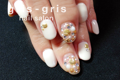 白よりは少しベージュがかった象牙色のワンカラーに、夏らしい海のモチーフでうめつくしてみました。夏ネイルです!!参考価格¥7800桜新町 用賀 ネイルサロン グリグリJUGEMテーマ:ジェルネイルJUGEMテーマ:カルジェル Calgel