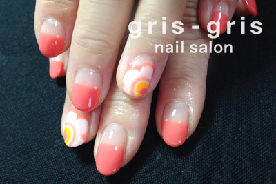コーラルオレンジのぱっつんフレンチに、大きな花を入れました。華やかで目を引くデザインですね〜参考価格¥7200桜新町 駒沢 ネイルサロン グリグリJUGEMテーマ:ジェルネイルJUGEMテーマ:カルジェル Calgel