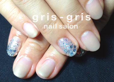 シンプルなベージュのグラデーション鏡のように反射するシルバーのホログラムがキラキラとポイントになっています参考価格 ¥7200世田谷区 桜新町 ネイルサロン グリグリJUGEMテーマ:ジェルネイルJUGEMテーマ:カルジェル Calgel