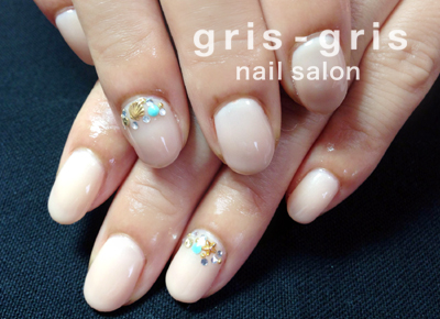 ヌーディーなピーチベージュのワンカラーです。根元に夏らしいイメージになるように飾ってみました。涼しげですね。参考価格¥7500桜新町 駒沢 ネイルサロン グリグリJUGEMテーマ:ジェルネイルJUGEMテーマ:カルジェル Calgel