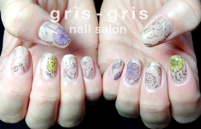 肌の色に近いベージュの上に、グレーで線描の花を描きました。野の花のような華奢なイメージです。所々に色を入れてシンプルにシックに仕上ました。参考価格¥8500桜新町 用賀 ネイルサロン グリグリJUGEMテーマ:カルジェル CalgelJUGEMテーマ:ジェルネイル