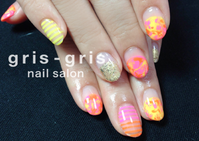 蛍光ピンクと、オレンジ、イエローでオーバルフレンチのマーブルを作りました。アクセントになるように、金箔のオーバルフレンチと、ピンストライプを入れてみました。楽しくまとまりましたよ〜参考価格¥7600桜新町 用賀 ネイルサロン グリグリJUGEMテーマ:ジェルネイルJUGEMテーマ:カルジェル Calgel