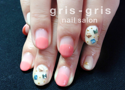 コーラルピンクのオーバルフレンチに、淡いベージュの組み合わせです。ワンカラーのベージュの上には色鮮やかなスタッズをのせました。きれいなカラーのスタッズはハードになりすぎなくて、いいです〜参考価格 ¥7300桜新町 用賀 ネイルサロン グリグリJUGEMテーマ:ジェルネイルJUGEMテーマ:カルジェル Calgel
