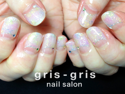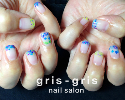 マスカット、タンジェリン、ストロベリー、グレープ、アクアブルーのラメを乳白色がかったクリアジェルにミックスして色同士が溶け合うようにぼかしこんでいます虹色の雲のようなホンワリ優しい印象です参考価格 ¥9000世田谷区 桜新町 ネイルサロン グリグリJUGEMテーマ:ジェルネイルJUGEMテーマ:カルジェル Calgel