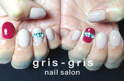 マゼンダピンクをミックスした赤とお肌なじみの良いベージュのワンカラーアクアブルー、オーロラブルー、ピスタチオグリーン、ミルキーホワイトと多色のストーンをライン状に並べてアクセントにしています参考価格 ¥7160世田谷区 桜新町 ネイルサロン グリグリJUGEMテーマ:ジェルネイルJUGEMテーマ:カルジェル Calgel