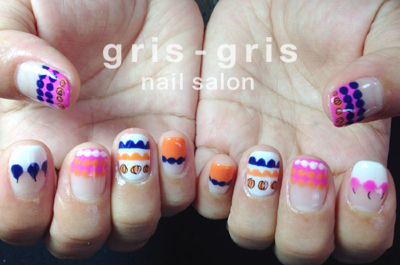 ドットをストライプのようにつなげた大胆な柄とハレーションをおこしそうな色使いが新鮮な北欧スタイルを意識したデザインネイルです。可愛いです〜〜参考価格¥8600桜新町 駒沢 ネイルサロン グリグリJUGEMテーマ:ジェルネイルJUGEMテーマ:カルジェル Calgel