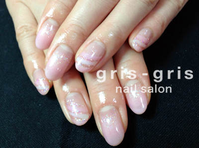 淡い透明感のあるピンクのグラデーションに、根元のほうにキラキラとオーロララメを入れて、アクセントに薬指と小指に白とラメを使って流れ星風なイメージで、斜めから流れるように入れてみました。参考価格¥8400桜新町 駒沢 ネイルサロン グリグリJUGEMテーマ:ジェルネイルJUGEMテーマ:カルジェル Calgel