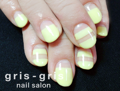 ひよこカラーが可愛い逆フレンチです。何本かをボーダーにしてシンプルながらほっこり可愛いネイルです。参考価格¥¥7400桜新町 世田谷 ネイルサロン グリグリJUGEMテーマ:ジェルネイルJUGEMテーマ:カルジェル Calgel