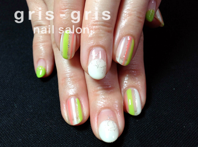 コーラル、スプリンググリーン、ホワイトを基調に、爽やかなストライプとオーバルフレンチのネイルです。フレンチの上にはシルバーラメで、幾何学の模様を入れてみました。春らしいネイルです。参考価格¥8500桜新町 駒沢 ネイルサロン グリグリJUGEMテーマ:ジェルネイルJUGEMテーマ:カルジェル Calgel