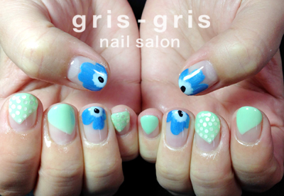 コバルトブルーの花と、エメラルドグリーンのドロップの大胆な柄の組み合わせが可愛い、北欧風なネイルです。白いドットも印象的ですね〜可愛いです〜参考価格¥8100桜新町 駒沢 ネイルサロン グリグリJUGEMテーマ:ジェルネイルJUGEMテーマ:カルジェル Calgel