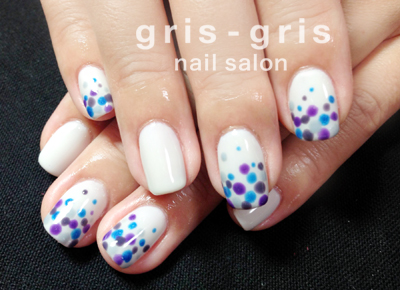 淡いグレーのワンカラーの上に4色のドットをランダムにのせました。モダンなドットネイルです。参考価格¥9000桜新町 世田谷 ネイルサロン グリグリJUGEMテーマ:ジェルネイルJUGEMテーマ:カルジェル Calgel