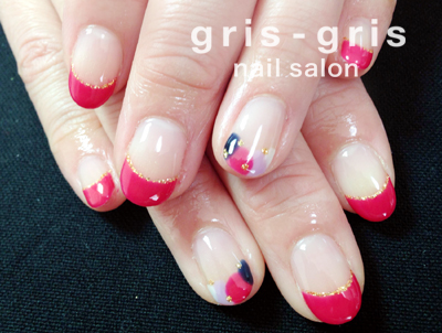 チェリーピンクのフレンチです。2本だけ、白と、パンジー、チェリーピンク、ネイビーの4色で変わりフレンチにしてみました。雰囲気が変わって新鮮です。参考価格8200桜新町 渋谷 ネイルサロン グリグリJUGEMテーマ:ジェルネイルJUGEMテーマ:カルジェル Calgel