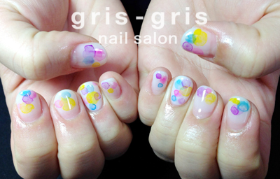 水まんじゅうの白のグラデーションに原色のままの色を使ってふわふわに、丸く描いてみました。春らしくて可愛いです〜〜参考価格¥9000桜新町 駒沢 ネイルサロン グリグリJUGEMテーマ:ジェルネイルJUGEMテーマ:カルジェル Calgel