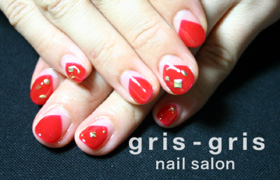 ブライトレッドのしずく型フレンチですゴールドのスタッズをパラパラっと散らして動きを出していますショートネイルに赤が映えます参考価格 ¥7060世田谷区 桜新町 ネイルサロン グリグリJUGEMテーマ:ジェルネイルJUGEMテーマ:カルジェル Calgel