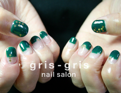直線でちょこっとづつ形を変えた変形フレンチです。深いグリーンでアクセントには星を使ってエレガントにまとめてみました。深いグリーンが新鮮でステキです参考価格¥7600桜新町 駒沢 ネイルサロン グリグリJUGEMテーマ:カルジェル CalgelJUGEMテーマ:ジェルネイル