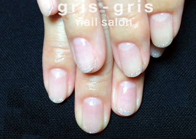 ほんのりピンク色のハニーピンクラメをベースに先端には細くアイスラメでフレンチを作っています透明感が美しいネイルです参考価格 ¥7000世田谷区 桜新町 ネイルサロン グリグリJUGEMテーマ:ジェルネイルJUGEMテーマ:カルジェル Calgel