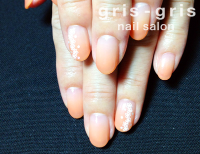 夕焼けのようなこっくりとしたオレンジのグラデーションです薬指には白いレースを入れてアクセントに参考価格 ¥7200世田谷区 桜新町 ネイルサロン グリグリJUGEMテーマ:ジェルネイルJUGEMテーマ:カルジェル Calgel