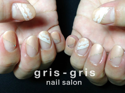 ベージュ系オレンジパールのバイヤスフレンチに白レースをのせました繊細な優しい色合いが綺麗です参考価格 ¥8400世田谷区 桜新町 ネイルサロン グリグリJUGEMテーマ:ジェルネイルJUGEMテーマ:カルジェル Calgel