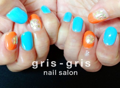 くりぬきに星型ホログラムをたっぷりのせたデザインですスカイブルーとオレンジの組み合わせがとてもキレイです参考価格 ¥7400世田谷区 桜新町 ネイルサロン グリグリJUGEMテーマ:ジェルネイルJUGEMテーマ:カルジェル Calgel