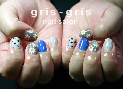筆タッチがしっかりある、絵画風な下地の上にお花やらドットなどを入れてまとめてみました。落ち着いた色で仕上げたドットやしずく、マーガレットのバランスも絶妙なネイルです。全体的にクラシカルな色調になりましたが、鮮やかなブルーがあることで、夏らしいネイルになりました。参考価格¥8800桜新町 駒沢 ネイルサロン グリグリJUGEMテーマ:カルジェル CalgelJUGEMテーマ:ジェルネイル