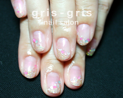 ほんのりパールピンクがベースのラメフレンチですラメはオーロラ感を出したかったので、ピーチ、タンジェリン、マスカット、アイスの4種類のラメをミックスして複雑な反射を作り出しましたさらにシェルを散らしてパール感のある輝きをプラス夏によく似合うラメフレンチです参考価格 ¥8000世田谷区 桜新町 ネイルサロン グリグリJUGEMテーマ:ジェルネイルJUGEMテーマ:カルジェル Calgel