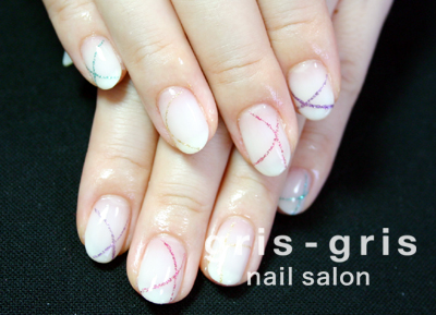 白のグラデーションに、カラフルなカラーラメで、美しい弧を描いてみました。ピンク、イエロー、パープル、ブルーの4色です。涼しげな中にもきりっとしたカラーが際立ってステキに仕上がりました。参考価格¥8000桜新町 駒沢 ネイルサロン グリグリJUGEMテーマ:ジェルネイルJUGEMテーマ:カルジェル Calgel