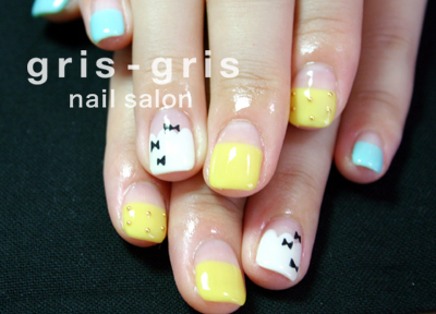 菜の花カラーとペールブルーのぱっつんフレンチです。白のフレンチはスカラップフレンチにして、ブラックリボンを飛ばしました。ポップなフレンチです。参考価格¥7360桜新町 駒沢 ネイルサロン グリグリJUGEMテーマ:ジェルネイルJUGEMテーマ:カルジェル Calgel