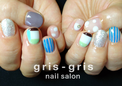 ストライプとドット、立方体、ラメにワンカラー、デザインミックスのモダンなネイルです薬指の立方体っぽいアートがポイントです参考価格 ¥7400世田谷区 桜新町 ネイルサロン グリグリJUGEMテーマ:ジェルネイルJUGEMテーマ:カルジェル Calgel