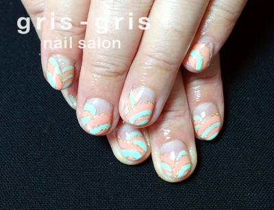 柔らかいカーブを描いたバイアス状のデザインネイルですオレンジとメロンミルクにゴールドラメのラインがキリッとアクセントになっています参考価格 ¥9000世田谷区 桜新町 ネイルサロン グリグリJUGEMテーマ:ジェルネイルJUGEMテーマ:カルジェル Calgel