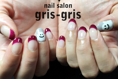 ワインカラーのシンプルなフレンチに可愛いおばけを入れてみました。ふふっと笑顔になるネイルです〜参考価格¥7400桜新町 駒沢 ネイルサロン グリグリJUGEMテーマ:ジェルネイルJUGEMテーマ:カルジェル Calgel