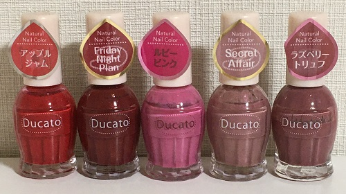 JUGEMテーマ:ネイル 「Ducato(デュカート)」のナチュラルネイルカラーシリーズ+αの ブルベさん、特に夏スモの方におすすめのカラーのご紹介、第2弾です。 第1弾、ピンク系はこちら 前回と同じく、ボトルを見ただけではわかりにくい透け感を ★の数で書いておきます。 こちら前回5段階評価と書きましたが、正確には星0〜5なので6段階ですね…? 今回は赤・ピンク系の5色です。 N86 アップルジャム 透☆☆☆☆☆ 2018年春の限定...