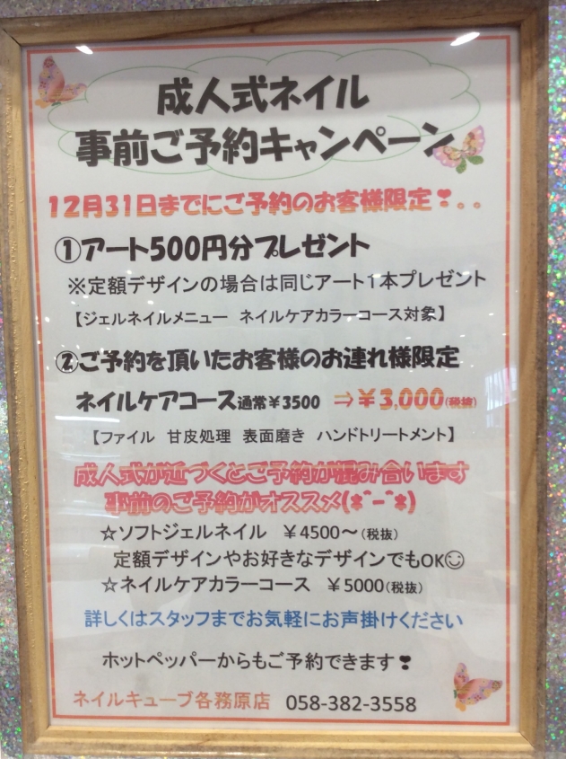 JUGEMテーマ:ネイル こんにちは〜☺✨ ネイルキューブ各務原店です💅 皆さま成人式の準備はお済みですか?!✨ ネイルのご予約がまだの方はお急ぎ下さいー❤ 12月31日までにご予約頂くとお得な割引がございます💕 ?アートが500円分プレゼント🎁 ?ご予約頂いたお客様のお連れ様ネイルケアコース3500円→3000円💅 成人式が近くなると混み合いますのでお早目に🐈‼ ...
