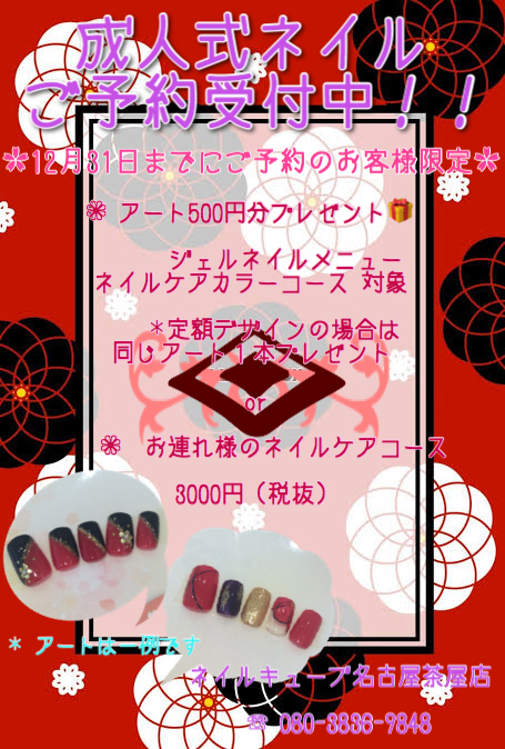 JUGEMテーマ:ネイル こんにちは❤ ネイルキューブ名古屋茶屋店です✨ ただ今、成人式ネイルのご予約を受付中です💕 お早目めのご予約がおススメです😊