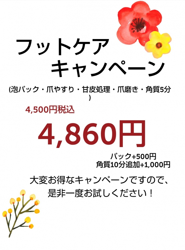 JUGEMテーマ:ネイル みなさんこんにちわ☆ 本日はフットケアキャンペーンのご紹介です。 泡パック・爪やすり・甘皮処理・爪磨き・角質5分が付きまして¥4860になっています☆ 6月までキャンペーンのほうしております! みなさまのご来店お待ちしております。 ネイルネイルあまがさきキューズモール店 ? 06-6423-9188
