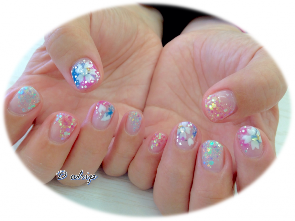 JUGEMテーマ:ネイル ラメ&ホロを斜めのグラデーションに♡ 4本はブルーピンクホワイトのタイダイ柄に、桜を描き、ラメを散りばめました♡ https://nailbook.jp/nail-salon/21282/