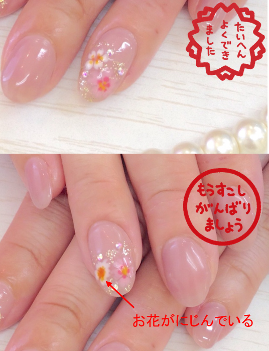 JUGEMテーマ:ネイル 残念なアートの紹介⤵ せっかくのアート(お花)がにじんでしまい目玉焼きに見えます。 やり直しです!