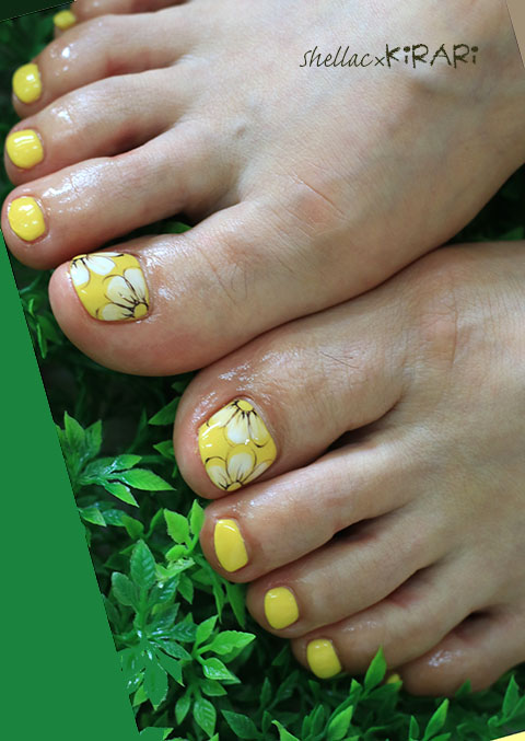 JUGEMテーマ:ネイル 担当:M シェラックフットです。 元気いっぱいのイエローを使って、足先からエネルギーを★ お花アートで可愛らしく仕上げです(´∀`*)
