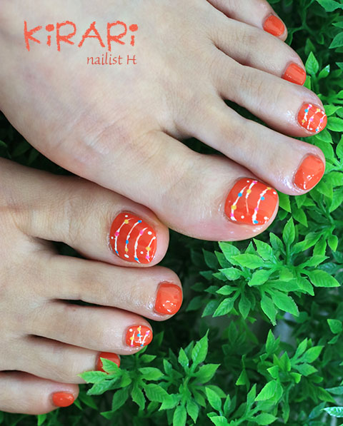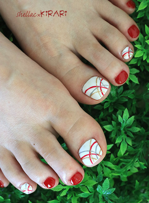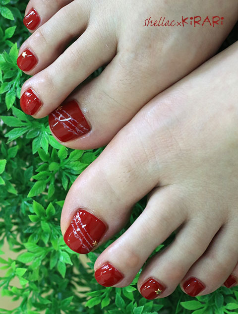 JUGEMテーマ:ネイル 担当:H シェラックフットです♪ ラインがいっぱい〜! 少し ”和” なテイストを醸し出す、 人気の赤を使ったオシャレフットです★