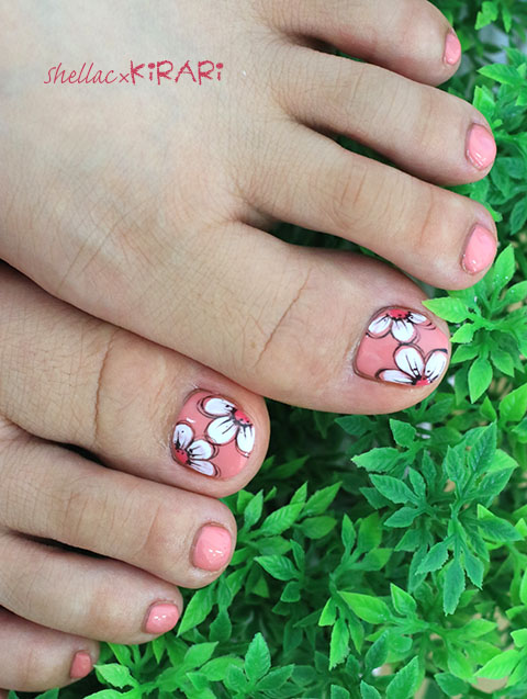 JUGEMテーマ:ネイル シェラックフットです♪ 薄づき仕上げのシェラックは、フラットなアートはお得意です。 大きめのお花は、遠くから見てもよ〜く見えてGOOD。 お花ちゃんは定番で人気がありますよ(´∀`*)