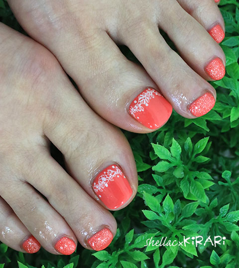 JUGEMテーマ:ネイル シェラックフットです。 親指の根元にレースをあしらって可憐にまとめました♪ 他のお爪にはラメを重ね塗りしています☆(´∀`*)