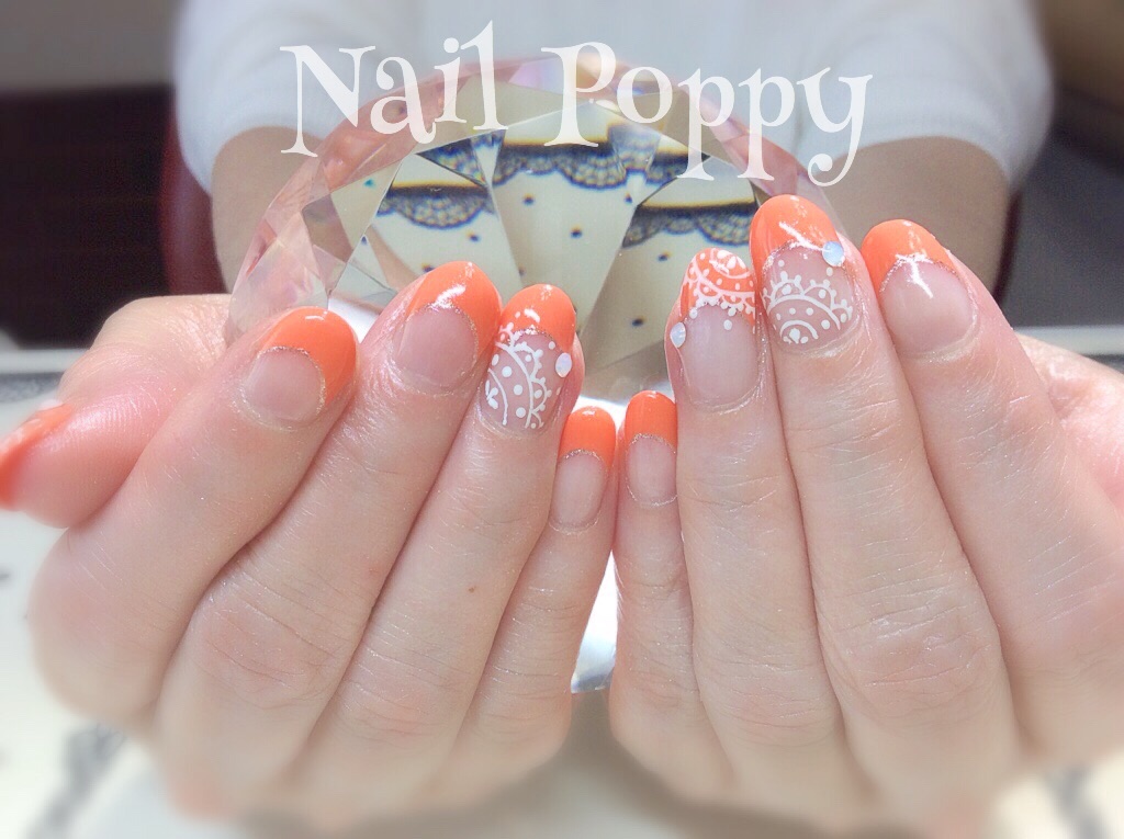 JUGEMテーマ:ネイル ぽかぽか陽気は久しぶりですね ネイルも明るいお色をチョイス! ラウンドレース 目を引く大人オレンジ ベースカラーが見え隠れする まあるいレース模様 スワロフスキーは ホワイトオパールで清楚に 私の大好きなこちらのオレンジ♡ オレンジのネイルってお肌に 合わせるのが何気に難しい 一歩間違えると?老けます...