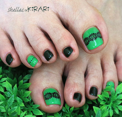 JUGEMテーマ:ネイル シェラックフット☆ 鮮やかグリーンと、ダークグリーンの明暗差コンビネーション(´∀`*) レースが色っぽいですよ〜。