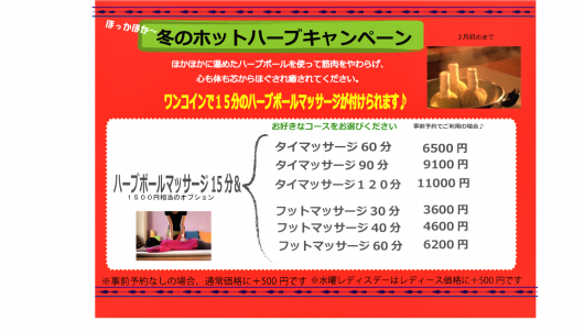 JUGEMテーマ:リラクゼーションマッサージ JUGEMテーマ:自分癒しをしよう!! 冬キャンペーン始まりました。 寒い時期に嬉しいオプション♪ ハーブボールマッサージを 通常10分1000円のところ、15分500円にて いつもよりとてもお得に受けられます。 お好きなタイ古式ボディ、またはフットマッサージに付けられます。 ハーブの力で身体の芯からぽかぽかしましょう(^^)