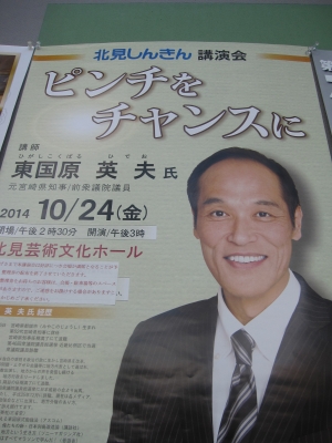 JUGEMテーマ:癒しのスクール 2014・10・24 今日、北見信金さん主催の講演がありました ゲストは元宮崎県知事の東国原氏です 「ピンチをチャンスに」という講和内容で、とっても楽しかった〜 1時間半ずっと笑いが絶えませんでしたよ まるでお笑いのライブのようです さすが、お笑い芸人をしていただけありますよね 小学校の夢から、なりたいのは「お笑い芸人」と「政治家」と書いていたんですって 2つとも叶ったなんて、すごいですよね〜 「努力すれば夢は叶う」というお話でした そして、今北...