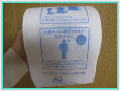 JUGEMテーマ:癒しのスクール2013・9・27先日、保健センターでがん検診の予約をして参りましたその時に先着30名までに特典があったんですそれがこれ トイレットペーパーですただのトイレットペーパーではなくがんリスクの告知ペーパーですこれって中々レアだと思いませんか市のがん検診は、胃・腸・肺でなんと1500円で受けられるんですよすっと会社勤めをしていたので知りませんでしたそれなのに、がん検診の受診率は50%なんですって低いと思いませんか大腸がんは早期発見で90%は完治知する病気です (トイレッ...
