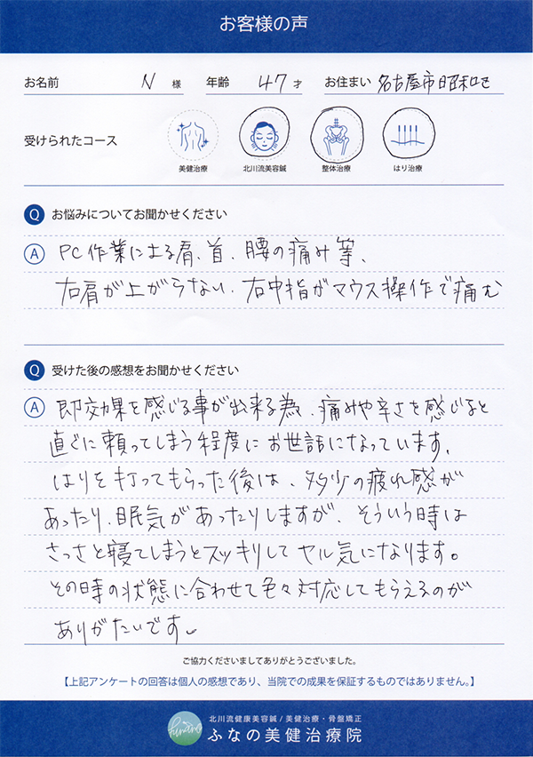 お名前 / 年齢 / お住まい N様 / 47歳 / 名古屋市昭和区 受けられたコース 美健治療 北川流美容鍼 整体治療 はり治療 お悩みについてお聞かせください PC作業による肩・首・腰の痛み等、 右肩が上がらない、右中指がマウス操作で痛む 受けた後の感想をお聞かせください 即効果を感じる事が出来る為、痛みや辛さを感じると直ぐに頼ってしまう程度にお世話になっています。 はりを打ってもらった後は、多少の疲れ感があったり、眠気があったりしますが、そういう時はさっさと寝てしまうと...