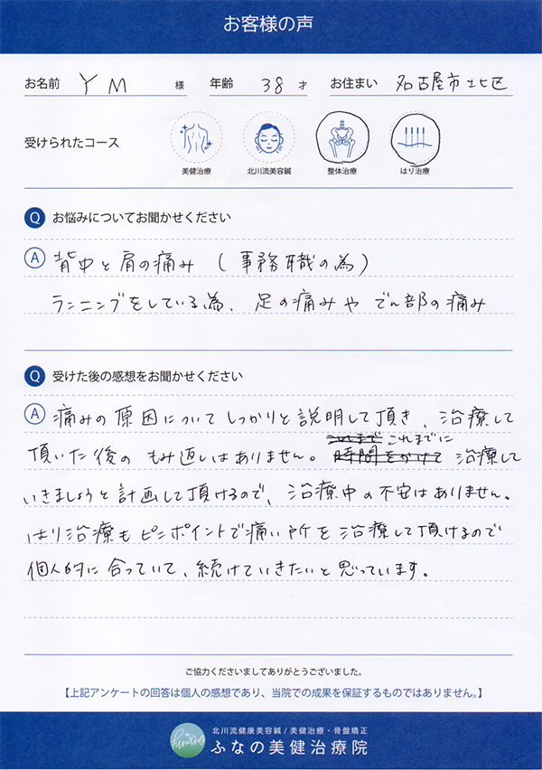 お名前 / 年齢 / お住まい Y.M様 / 38歳 / 名古屋市北区 受けられたコース 美健治療 北川流美容鍼 整体治療 はり治療 お悩みについてお聞かせください 背中と肩の痛み(事務職の為)、ランニングをしている為、足の痛みや臀部の痛み 受けた後の感想をお聞かせください 痛みの原因についてしっかりと説明して頂き、治療して頂いた後のもみ返しもありません。これまでに治療していきましょうと計画して頂けるので、治療中の不安はありません。 はり治療もピンポイントで...